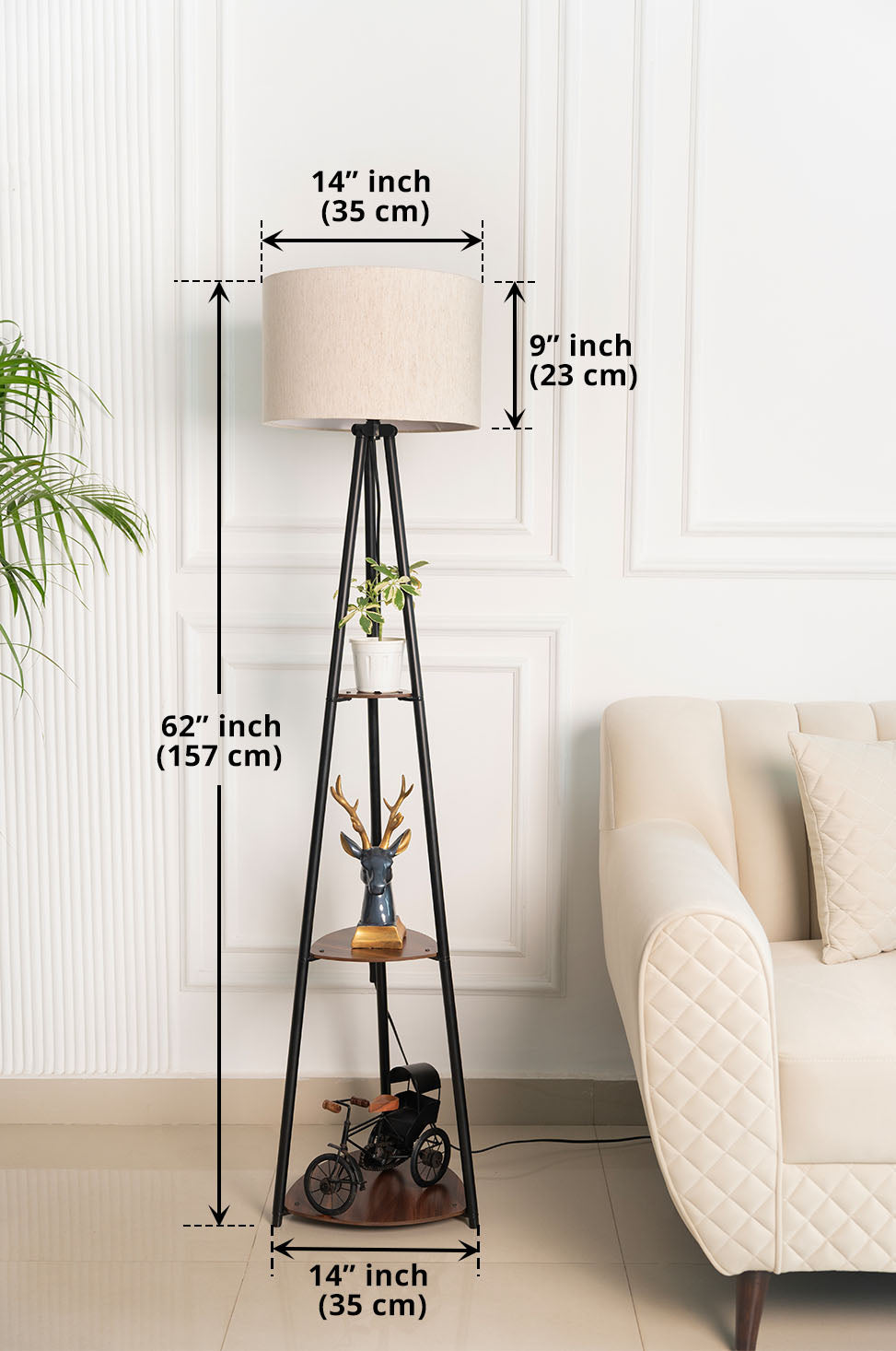 Overview: This black three shelves floor lamp is an ideal decor as well as a lighting piece for the living room, bedroom, and dining room. The unique design of this lamp elevates your space by giving it a modern and premium look. It comes with a 14" Drum Off White shade that is suitable for all backgrounds. It is also well suited to provide the perfect amount of light while setting up your space's ambience and mood.